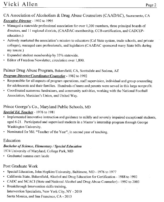 In the early 80's, I began working with high risk youth, and studied counseling in Dallas and Arizona, working for an innovative Adolescent program, for over a decade. My post graduate work included a successful completion at the top of my class at Cal State, Bakersfield, where I received my Alcohol & Drug Education Certification. In 1992-2005, I received both my state and national certifications following stringent re-certification hours and experience throughout the years.